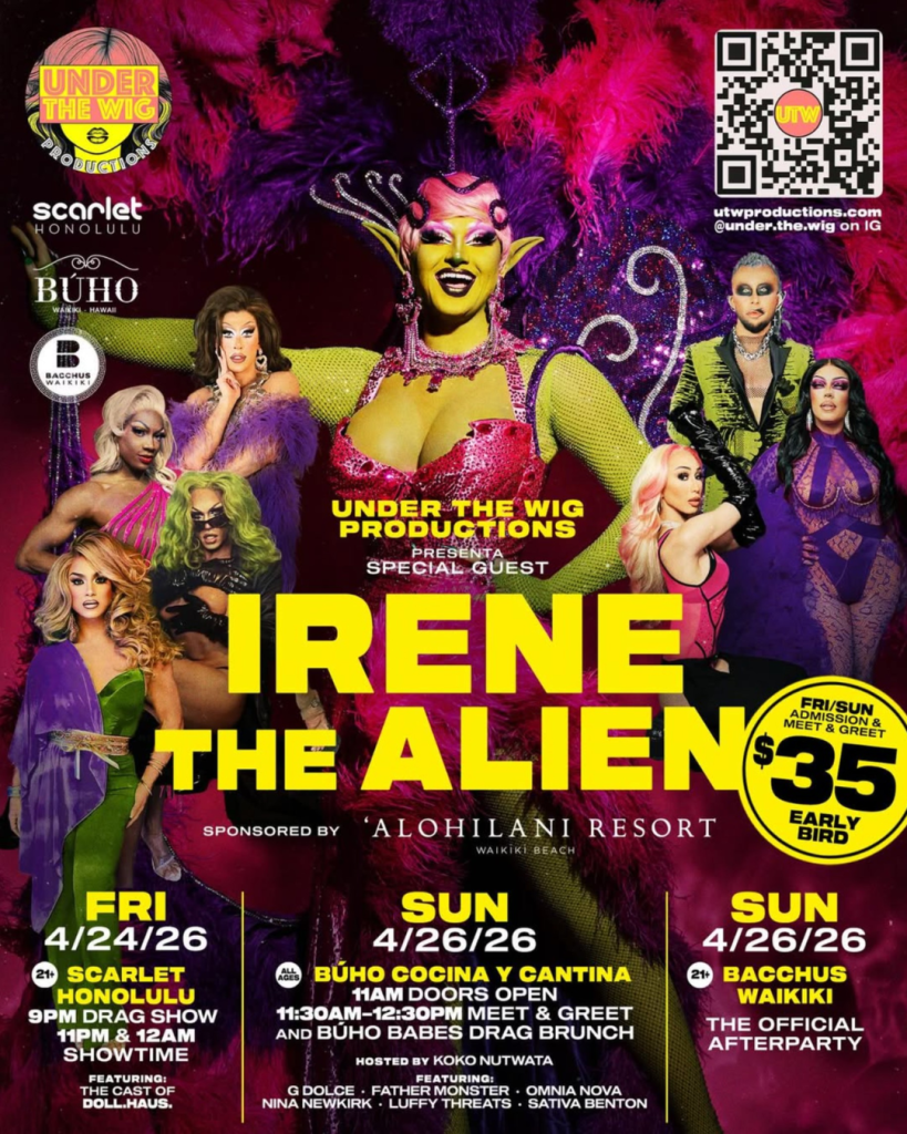 Under the Wig Productions announces a three-day entertainment experience in Honolulu featuring RuPaul’s Drag Race breakout star Irene the Alien. The multi-venue event will bring together performances, nightlife, and brunch programming across some of the island’s most recognized destinations.