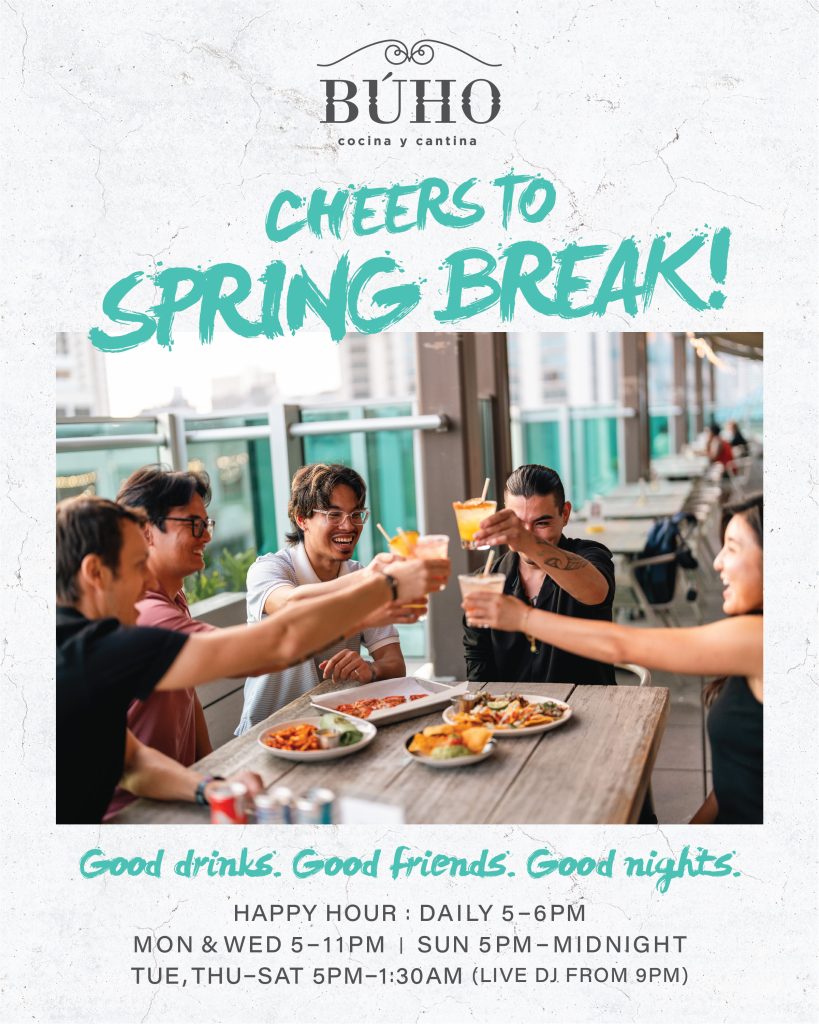 BÚHO Cocina y Cantina looks forward to providing a festive environment for guests to enjoy drinks, music, and the rooftop experience during Spring Break.