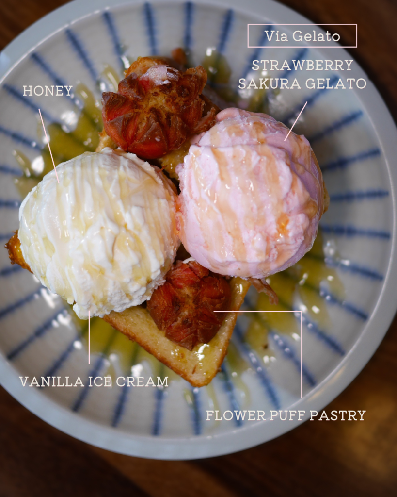 This spring-inspired creation features a harmonious blend of flavors and textures, including creamy vanilla ice cream paired with fragrant strawberry sakura gelato. The dessert is elegantly topped with a delicate flower-shaped puff pastry and finished with a drizzle of honey, offering a visually stunning and indulgent experience. Perfect for sharing or as a personal treat, it captures the essence of the season.