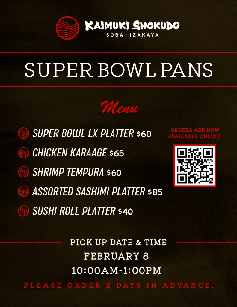Kaimuki Shokudo is offering Super Bowl pans for game day. All pans are prepared for sharing and suitable for larger groups.