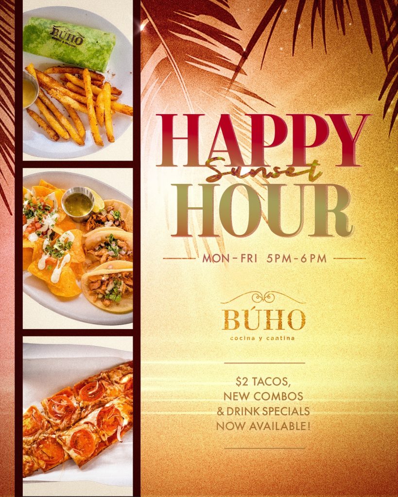 Join us at Búho Cocina y Cantina’s rooftop sunset Happy Hour in Waikiki! Enjoy special drinks, tasty bites, and good vibes with your crew as the sun goes down 🌮🌯🍕🍹